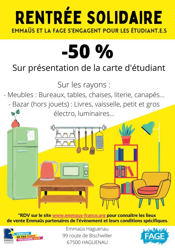 Alors que la précarisation frappe les jeunes de plein fouet, Emmaüs soutient les étudiants en leur proposant une vente solidaire dès la rentrée. Du 1er septembre au 1er octobre, ils pourront venir s’équiper à des prix réduits à Emmaüs Haguenau.